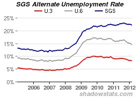 Compare the 'official' red line % of unemployment to the second graph from SGS (Shadow Government Statistics) showing actual unemployment % ......which is WORSE than the Great Depression from the first graph.